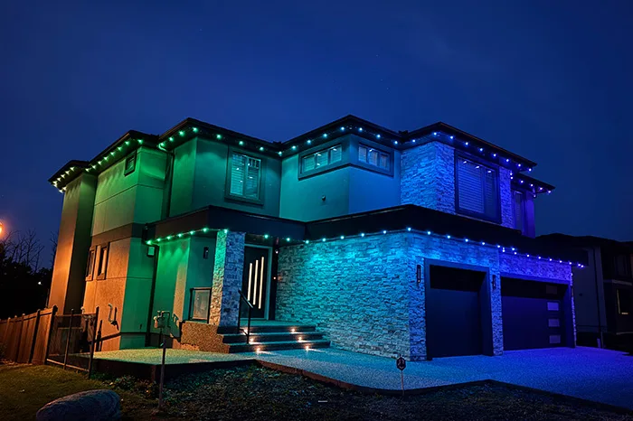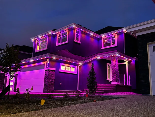 Our lighting systems are designed to enhance your home’s look without standing out when not in use. During the day, the lights are discreetly embedded along the roofline — nearly invisible from the street. At night, they come alive with vibrant effects and clean lighting patterns that amplify the architectural features of your property.